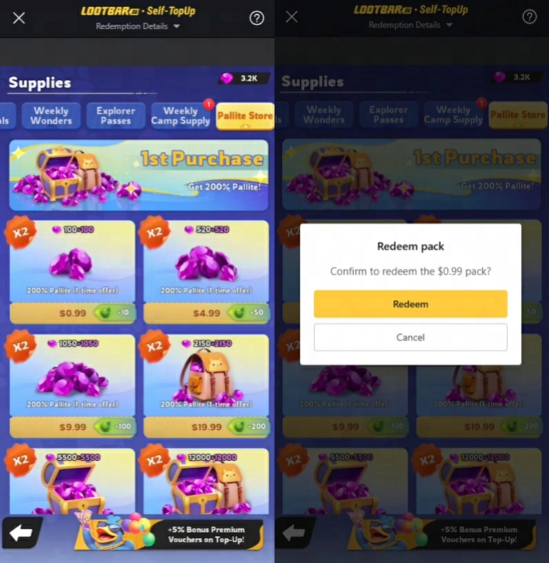 1. بسبب اختلاف العملات، يتم عرض سعر الحزمة في متجر LootBar داخل اللعبة بالدولار الأمريكي. إذا كنت تستخدم عملة غير الدولار الأمريكي، يمكنك تبديل العملة المعروضة إلى الدولار الأمريكي لعرض السعر المقابل. يمكنك اختيار أي حزمة ذات قيمة معادلة للشراء.