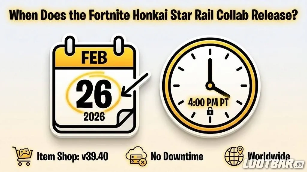 The Fortnite Honkai Star Rail collaboration was released on February 26, 2026, at 4:00 PM Pacific Time. The skins will appear in Fortnite's Item Shop as part of the v39.40 update cycle. Item Shop updates at the same moment worldwide. There is no server downtime needed to access the new skins. Players just need to open Fortnite and visit the Item Shop after the release time.
