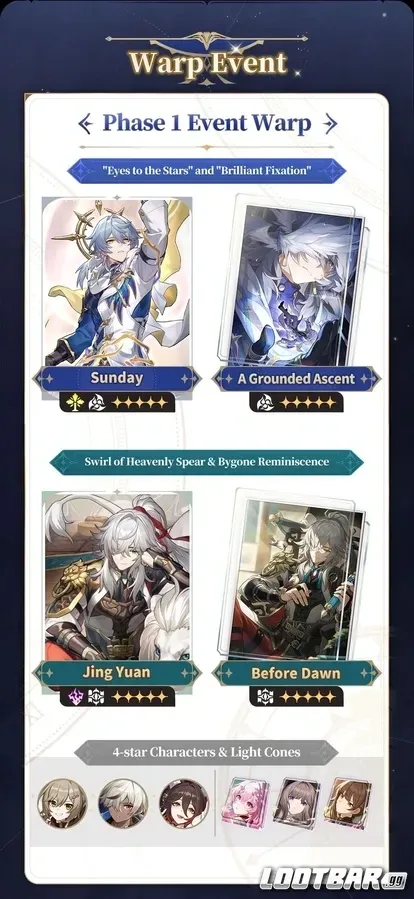 5-star characters: Sunday (NEW! Imaginary, Harmony), Jing Yuan (Lightning, Erudition)