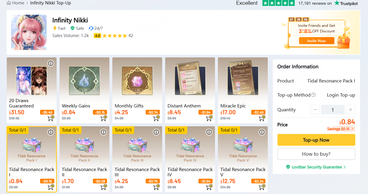 Infinity Nikki Top Up page on LootBar