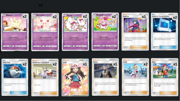 The primary issue with this deck is that it demands the player to set up multiple Sweets Relays, but the Pokémon that have the move are fairly squishy. That’s where Leaf and Red come into play, since they can ensure that Milcery and Swirlix can either deal more initial damage against the enemy’s basic Pokémon or retreat without consuming valuable energy points if required.