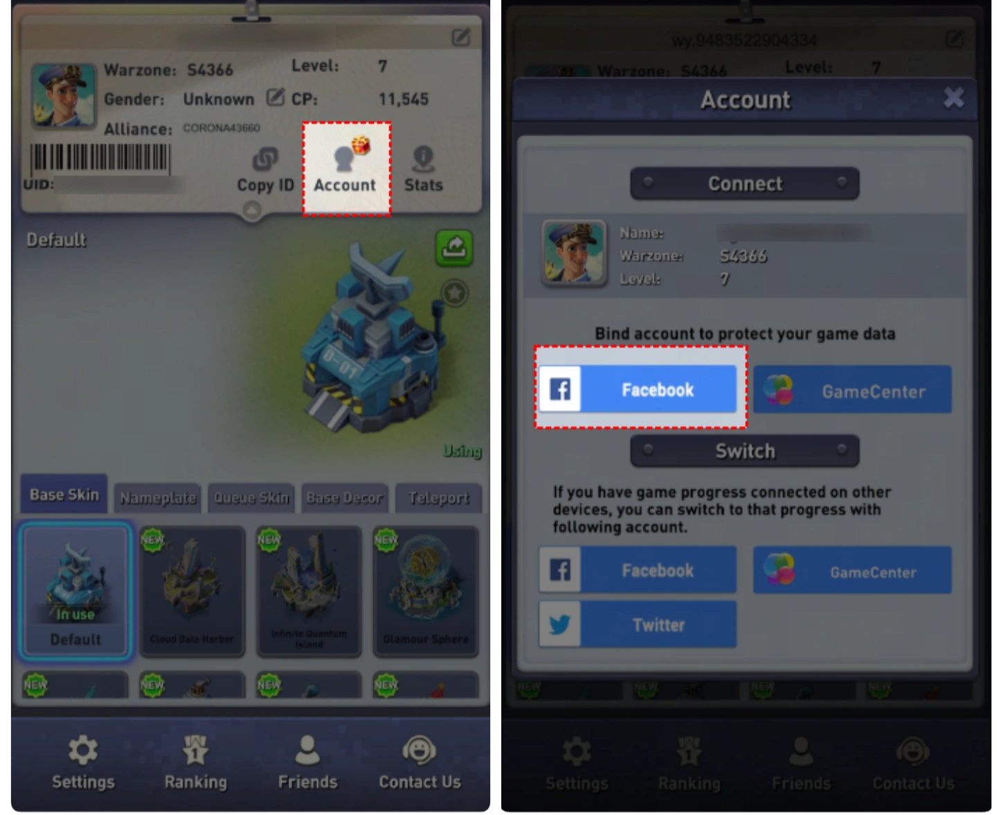 2. Klicken Sie auf Konto, um die Kontoseite zu betreten. Wenn Ihr Konto nicht gebunden ist, binden Sie es bitte an Facebook für eine schnellere Lieferung.