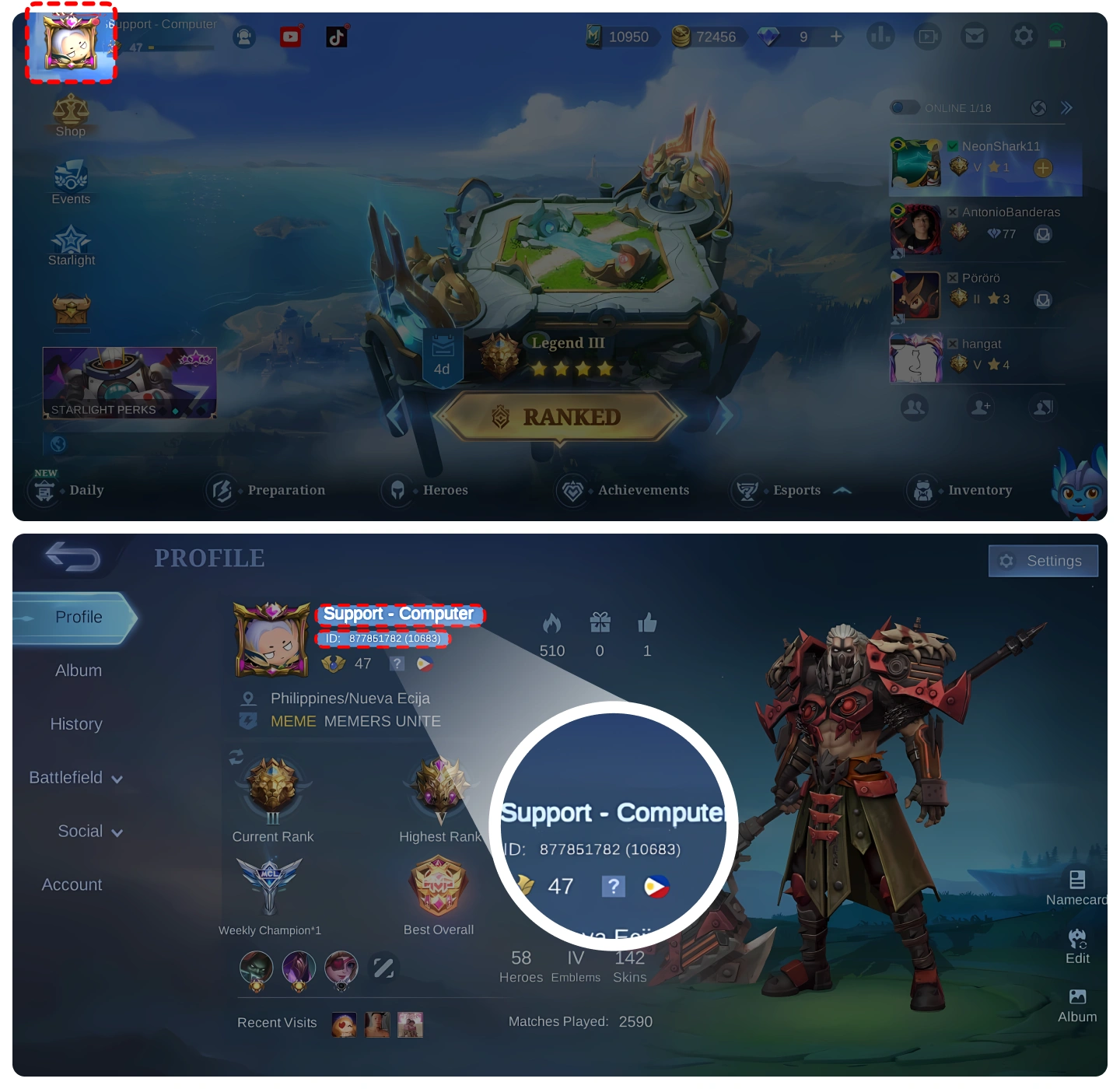 Consulta las capturas de pantalla a continuación para tu UID de MLBB y nombre de personaje: