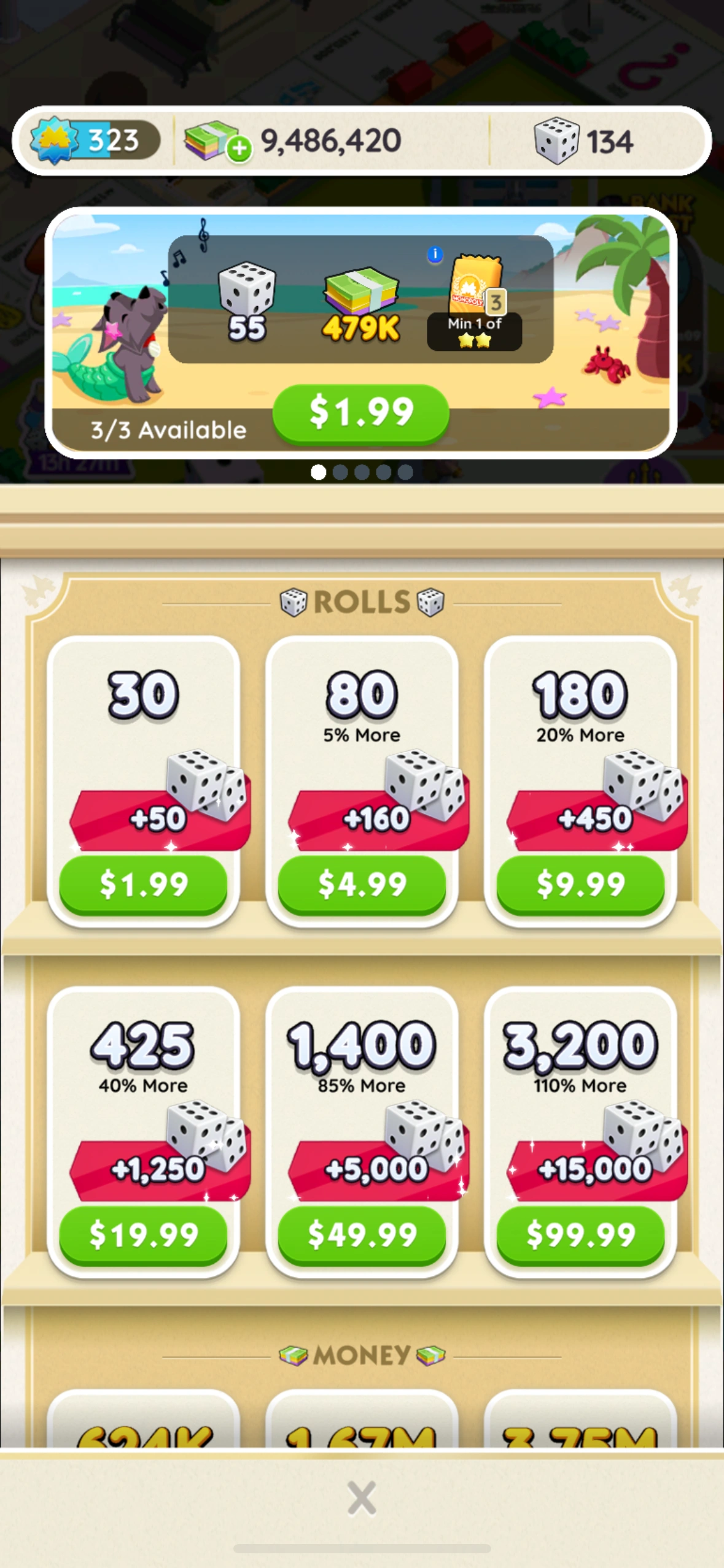 Por supuesto, una forma más rápida es comprar directamente en el juego. A continuación se muestran los precios para comprar MONOPOLY Go! Rolls en la tienda del juego.