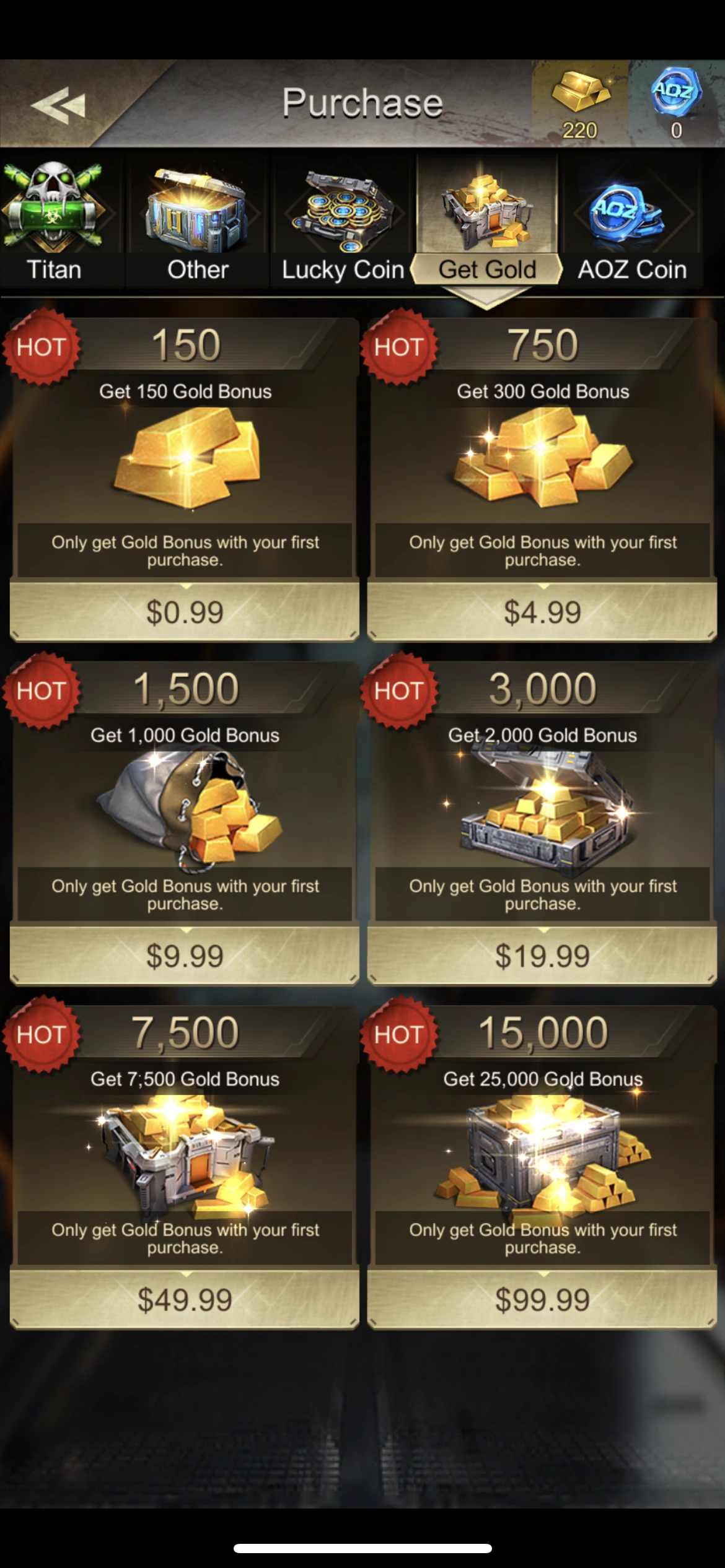 La première recharge pour Age of Origins 150, 750, 1500, 3000, 7500, 15000 or accorde de l'or AOZ supplémentaire selon les règles du jeu. Pour plus de détails, veuillez consulter la boutique Age of Origins.