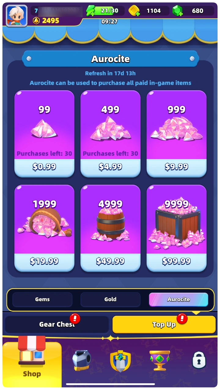 Dans Archero 2, l'Aurocite est une monnaie premium qui ne peut être obtenue que par des recharges et des achats en argent réel. LootBar est la plateforme de recharge préférée pour des transactions fluides, des offres exclusives et une expérience d'achat sécurisée. La boutique officielle en jeu est également disponible comme alternative pratique pour acheter de l'Aurocite.