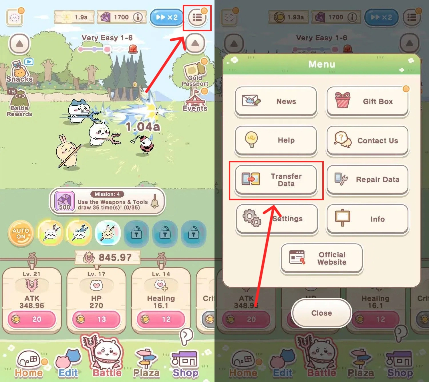 1. 右上のメニューを開き、「Transfer Data」をクリックして「Transfer ID」を設定してください。