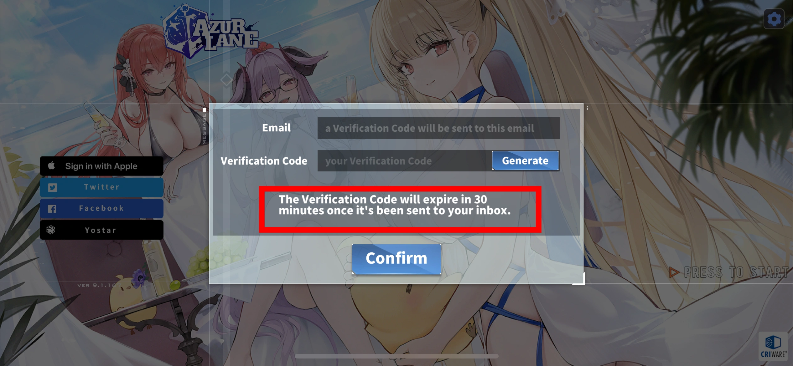 Select Yostar on the left side of the login page, enter the email you want to bind and you will get a verification code. The validity of the code is 30 minutes. Please provide the verification code as soon as possible in order to complete the recharge.