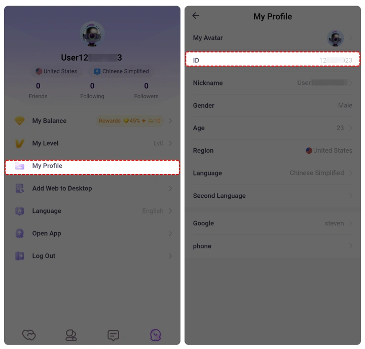 2.Go to 'My Profile', get your Chamet ID under 'My Avator'.