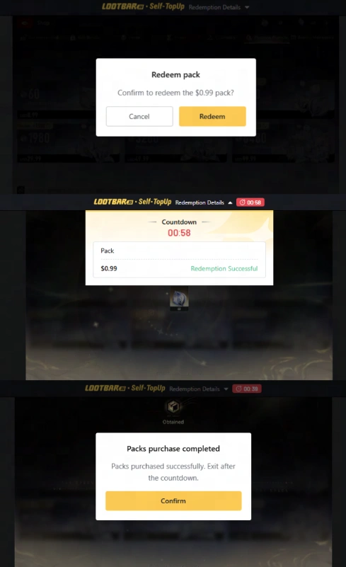 3. Confirm the information of the gift pack you want to purchase, claim your gift package, and your login information will be automatically cleared after exiting Self-TopUp.
