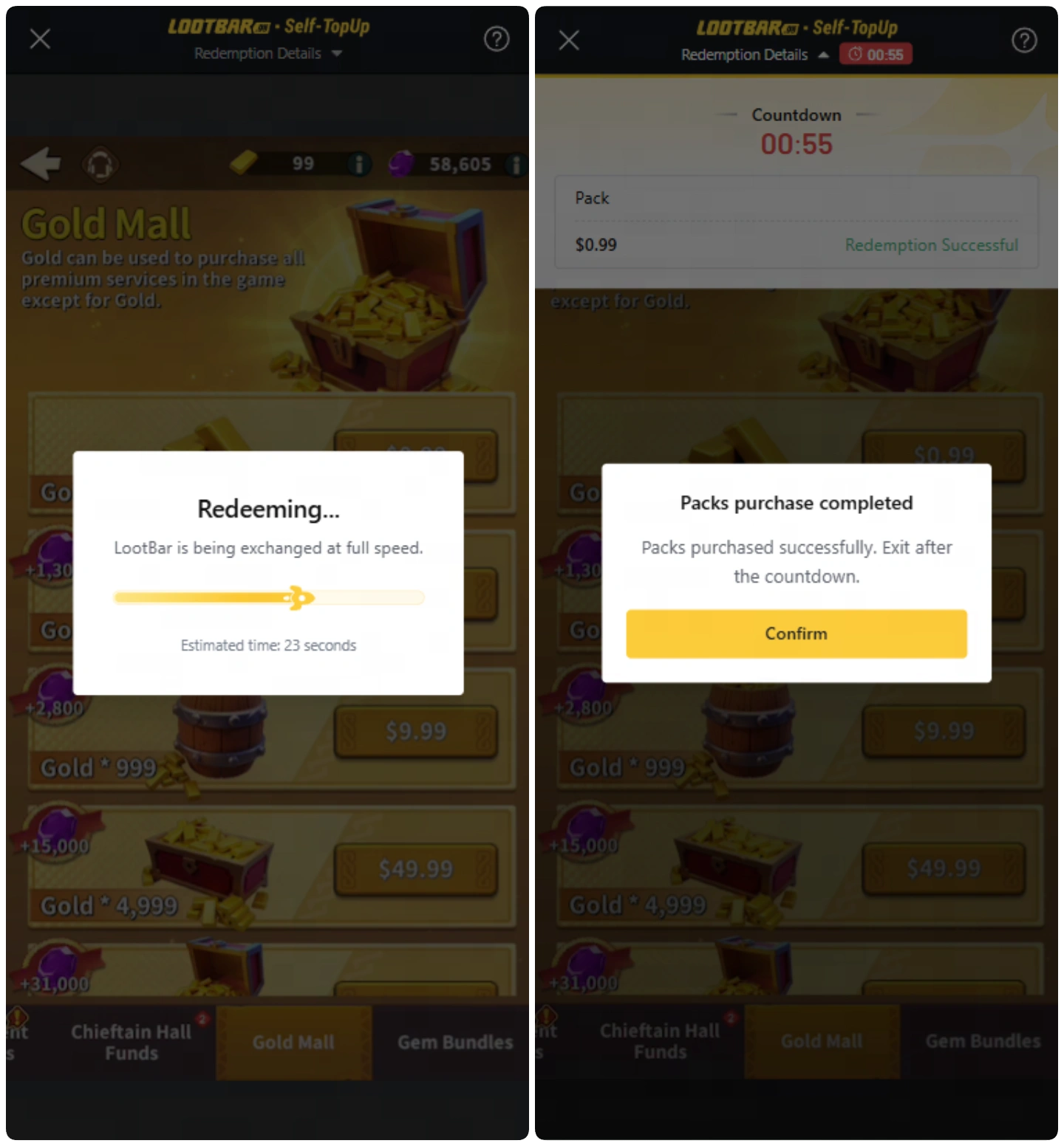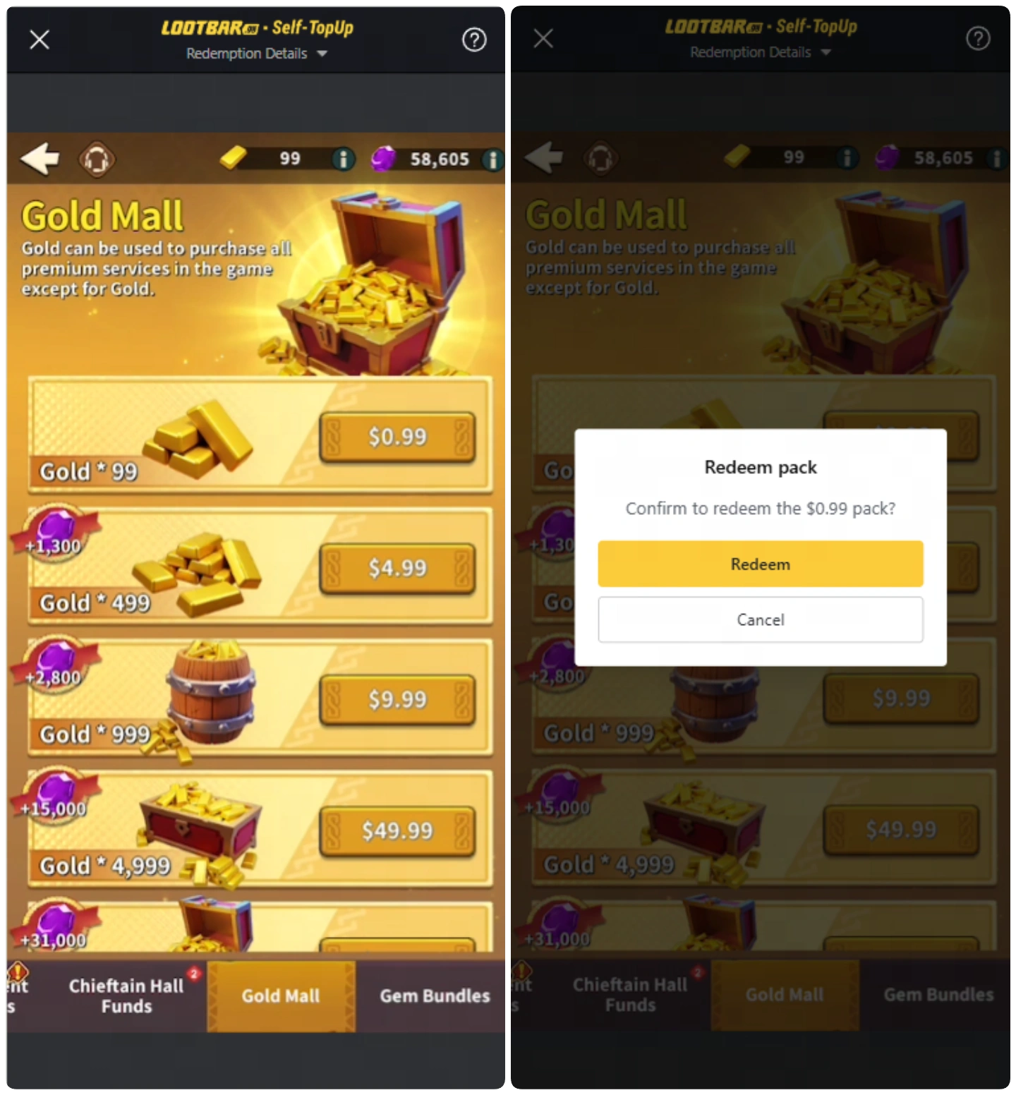 3. Confirm the information of the gift package you want to purchase, claim your gift package, and your login information will be automatically cleared after exiting the Self-TopUp results.