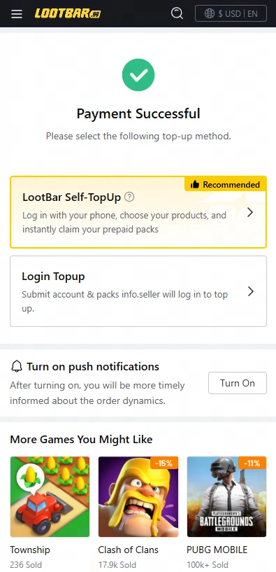 5. After the top-up is completed, you will receive a notification, and then you can log in to the game to verify the transaction.