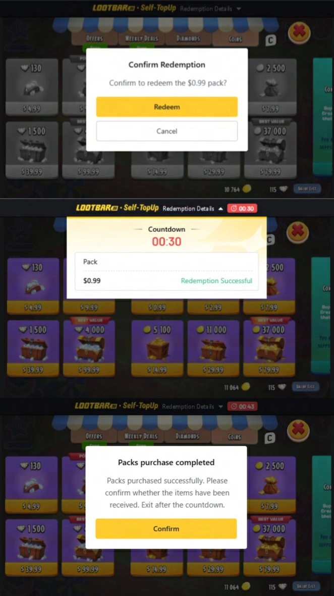 3. Confirm the information of the gift pack you want to purchase, claim your gift package, and your login information will be automatically cleared after exiting Self-TopUp.