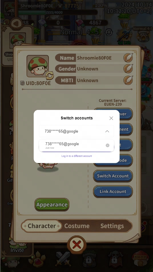 2. Enter your Character Center, you can find your Currant Server. Click the Linked Account to check your login details. If you log in as a guest, please link your email address here.