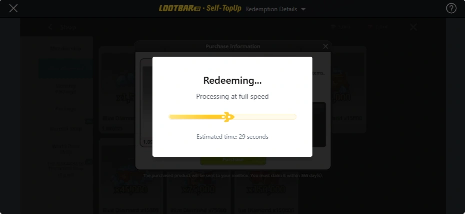 Log in to your game account via Self-TopUp and redeem the package you purchased on the platform in-game.