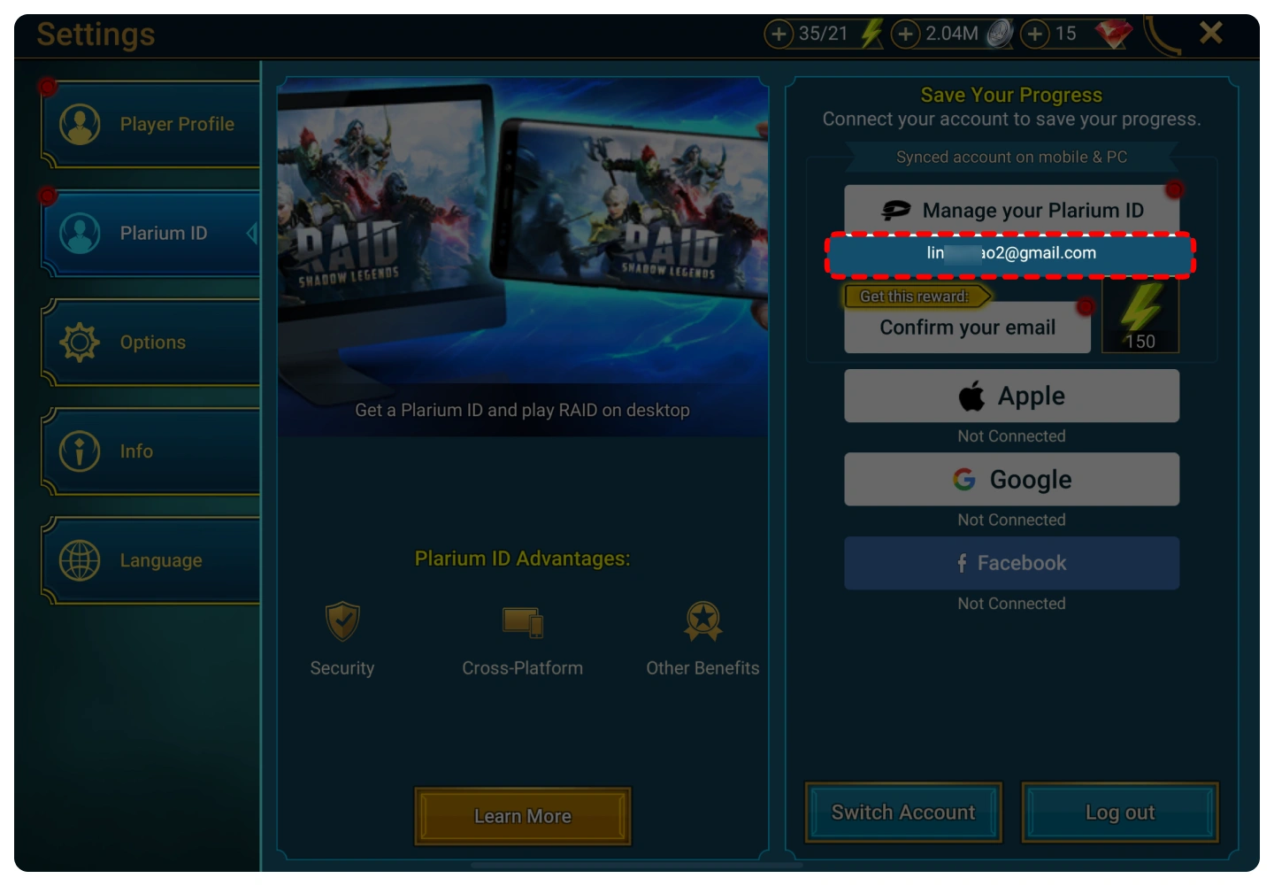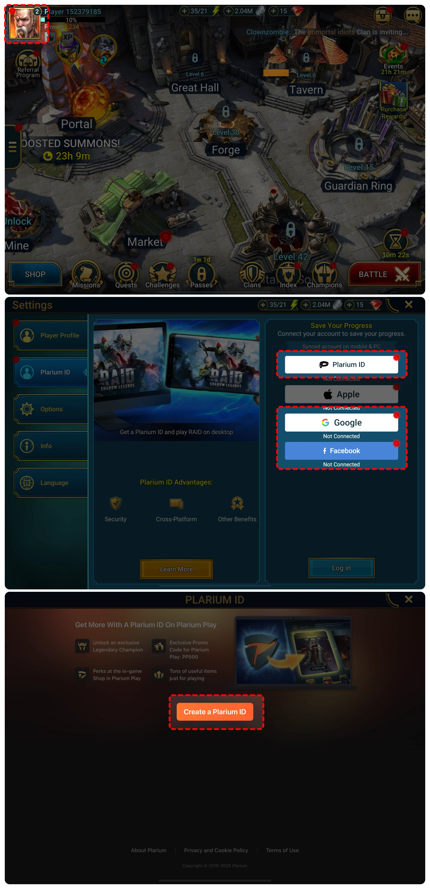 1. You can obtain your Login Account details in the Account page. If you are logged in as a guest, please bind your Plarium ID/ Google/ Facebook Account in accordance with the following guidelines.