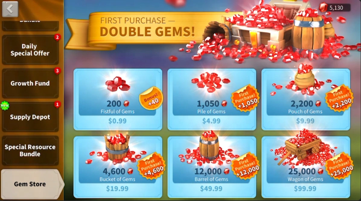 When you top up ROK Gems for the first time, you will receive additional in-game top-up rewards. Please refer to the Rise of Kingdoms in-game recharge rules for details.