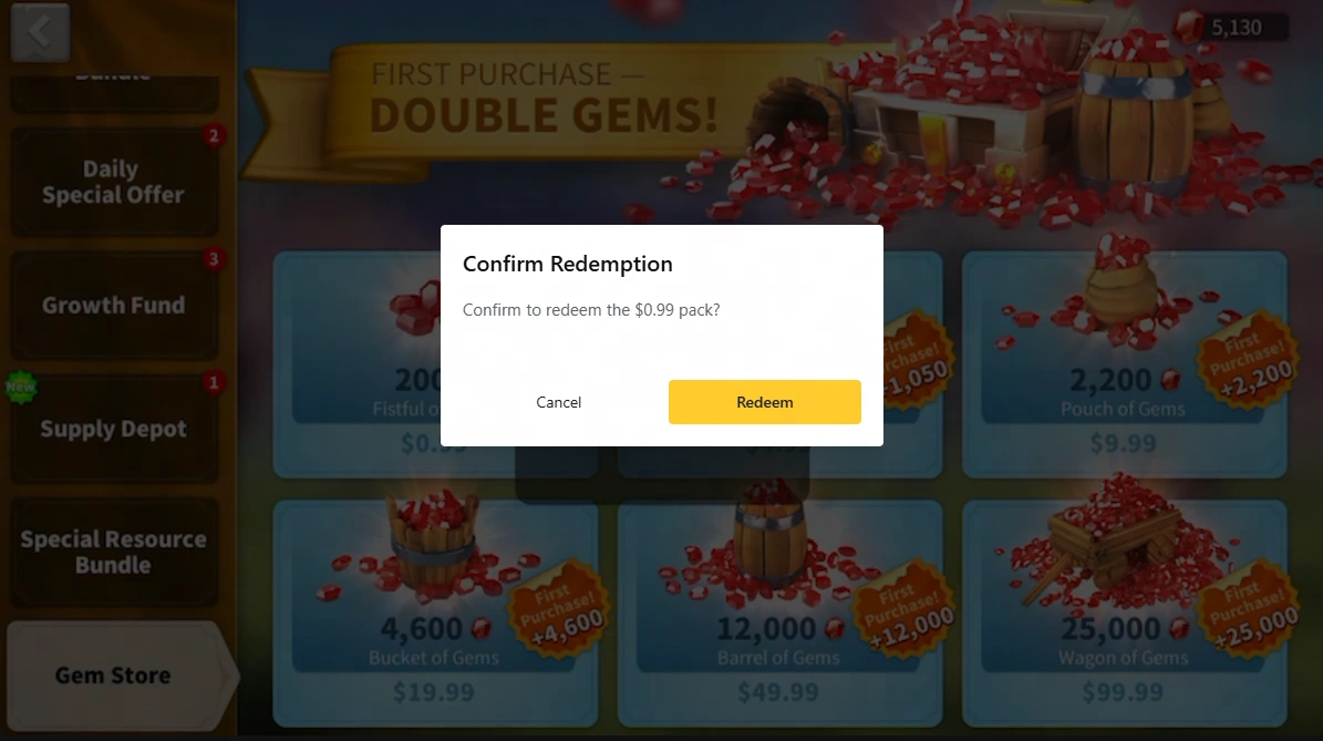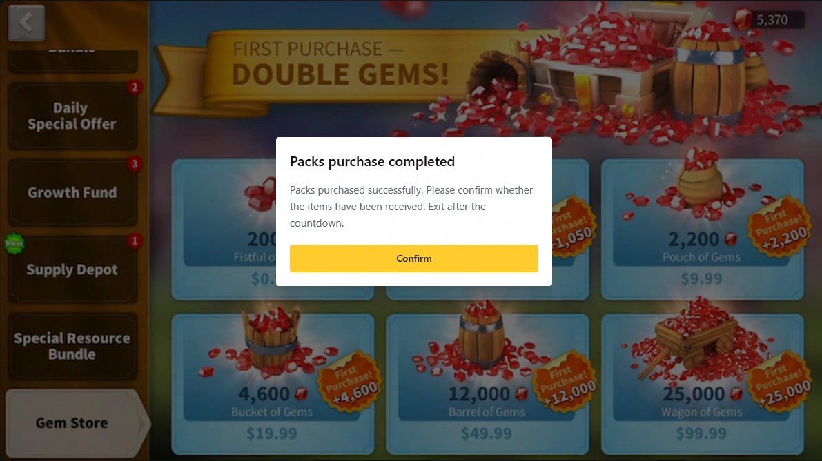 3. Select your purchase of Rise of Kingdoms Packs. Open your in-game store. Confirm your purchased package information and claim the corresponding gift package.