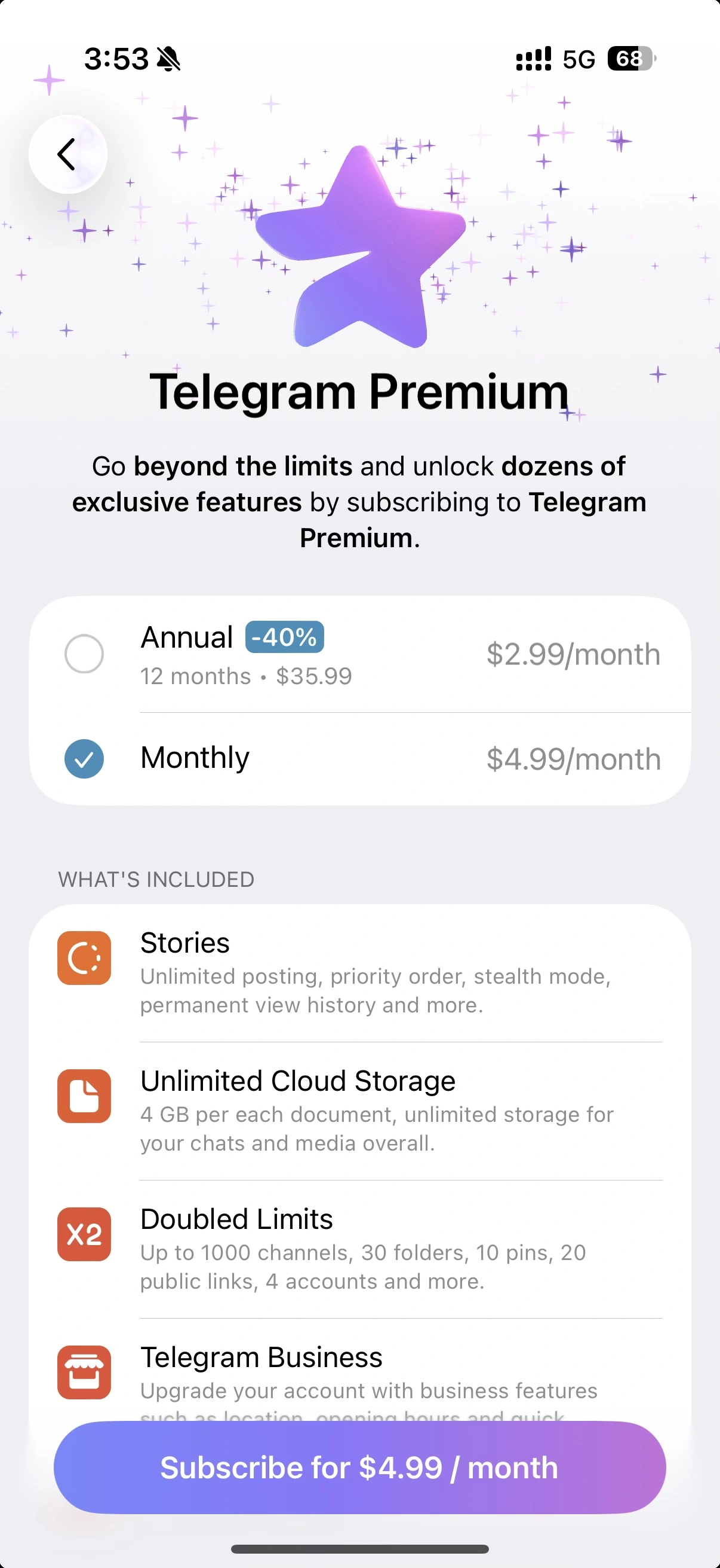 Telegram Premium is an optional subscription service that unlocks additional exclusive features, while helping support the development of the app. It is a part of Telegram’s sustainable monetization– driven by our users, rather than advertisers or shareholders. This way, Telegram can remain independent and prioritize its users first.