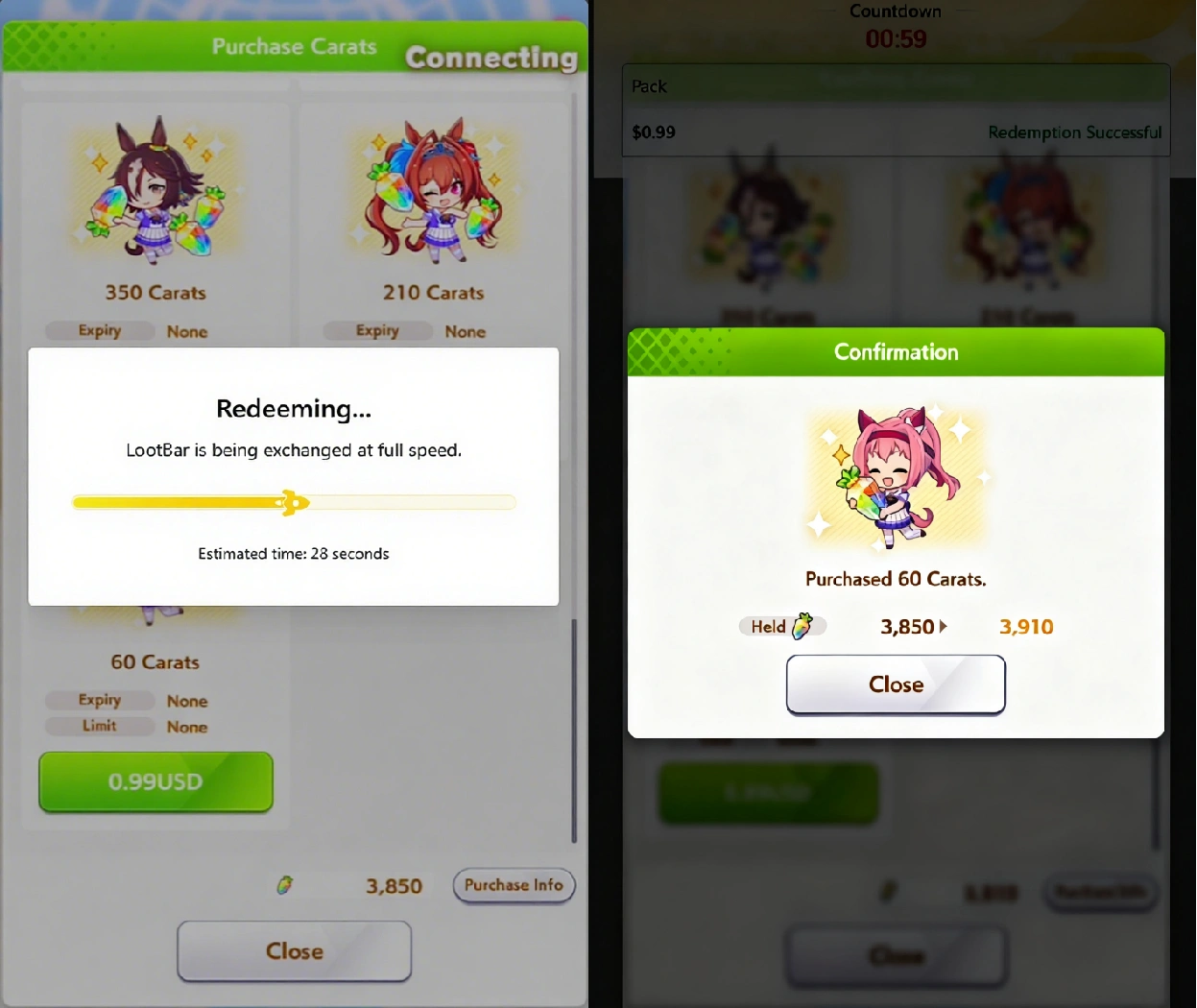 Accelerate your training: Training your Umamusume can be time-consuming, but Carats let you skip wait times and speed up the process. Recharge Umamusume: Pretty Derby Carats to power up your characters faster!