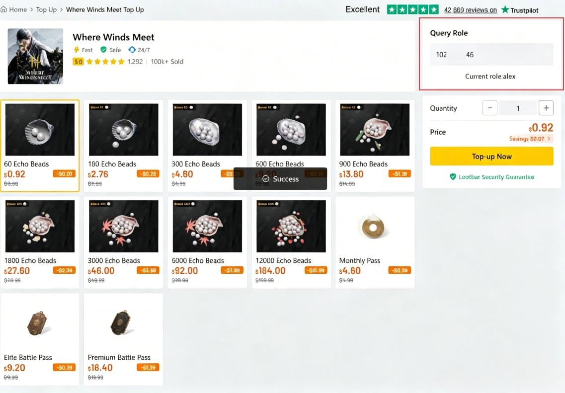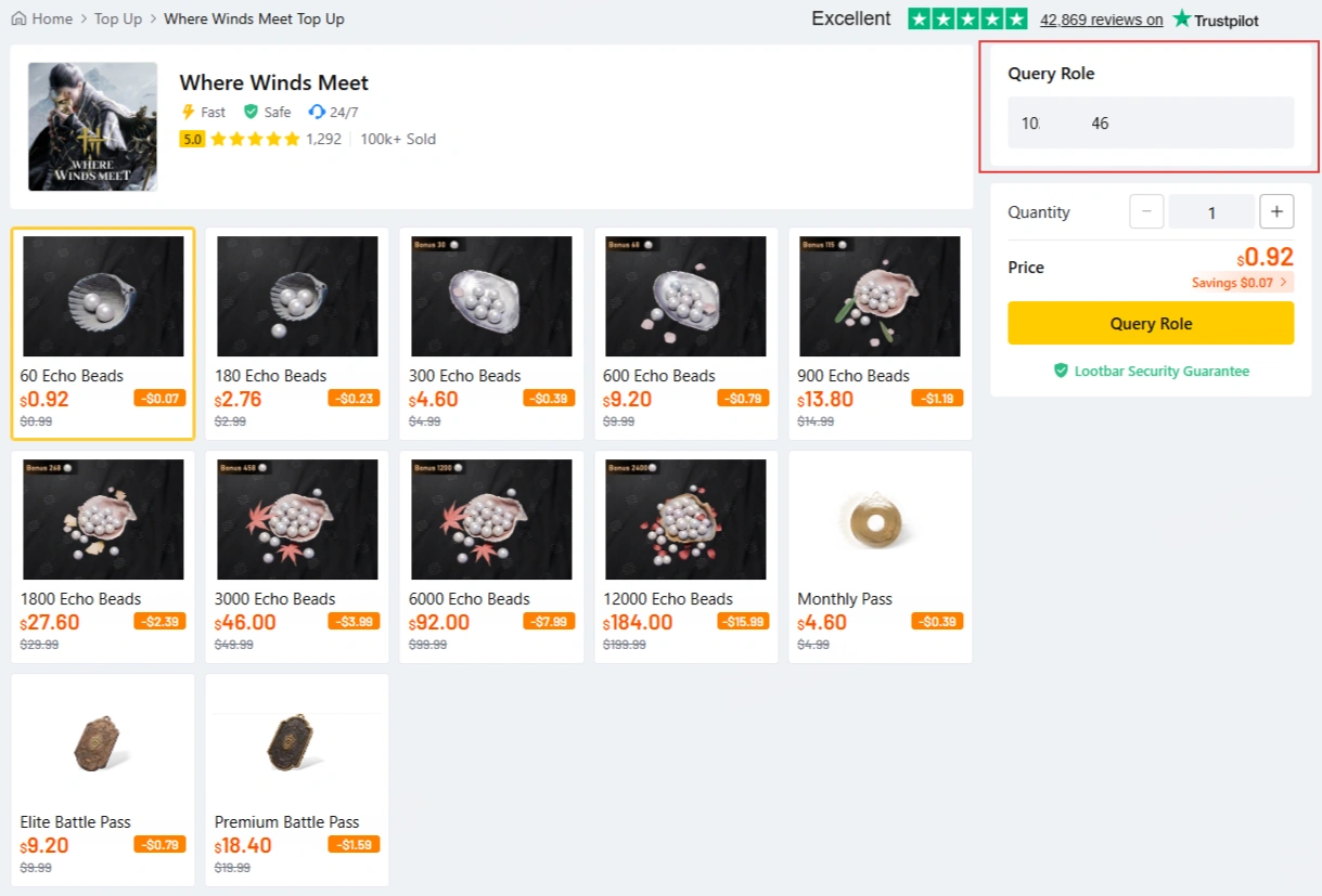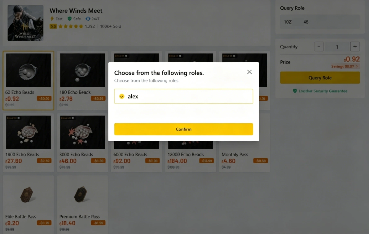 - To recharge, visit the official website or Lootbar.gg, choose Where Winds Meet, select the Echo Beads amount you need, and complete payment quickly and safely—so you can jump back into the game without hassle.