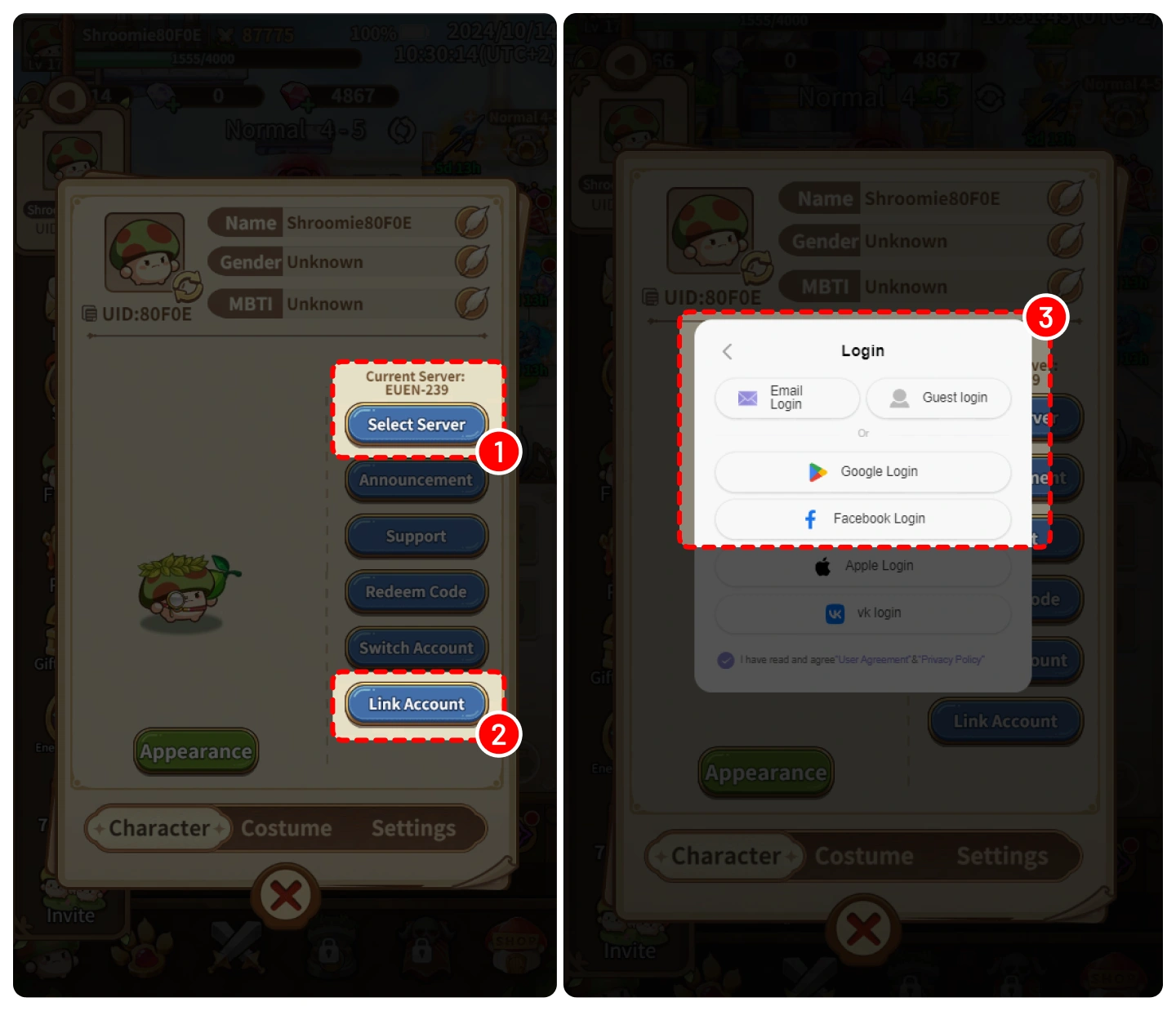 2.進入你的角色中心,你可以找到你的伺服器。在關聯帳戶確認您的登入詳細資訊。如果您以訪客身分登錄,請在此處連結您的電子郵件。