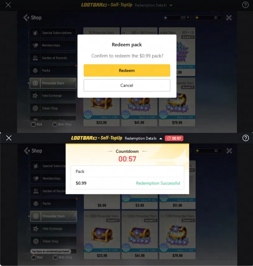 通過自助充值登錄您的遊戲賬戶,並在遊戲內的LootBar商店兌換您購買的禮包。